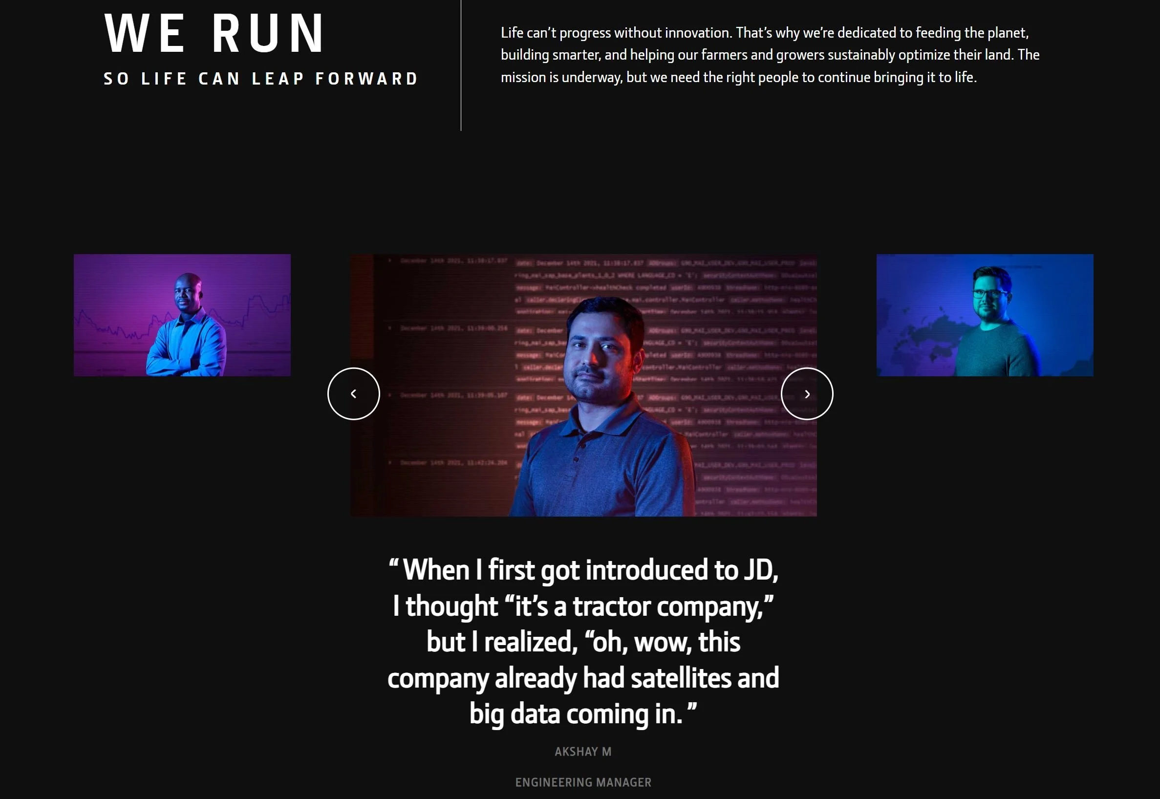 Deere asked us to give their tech recruiting a makeover to accompany the purpose line we created. We Run So Life Can Leap Forward.